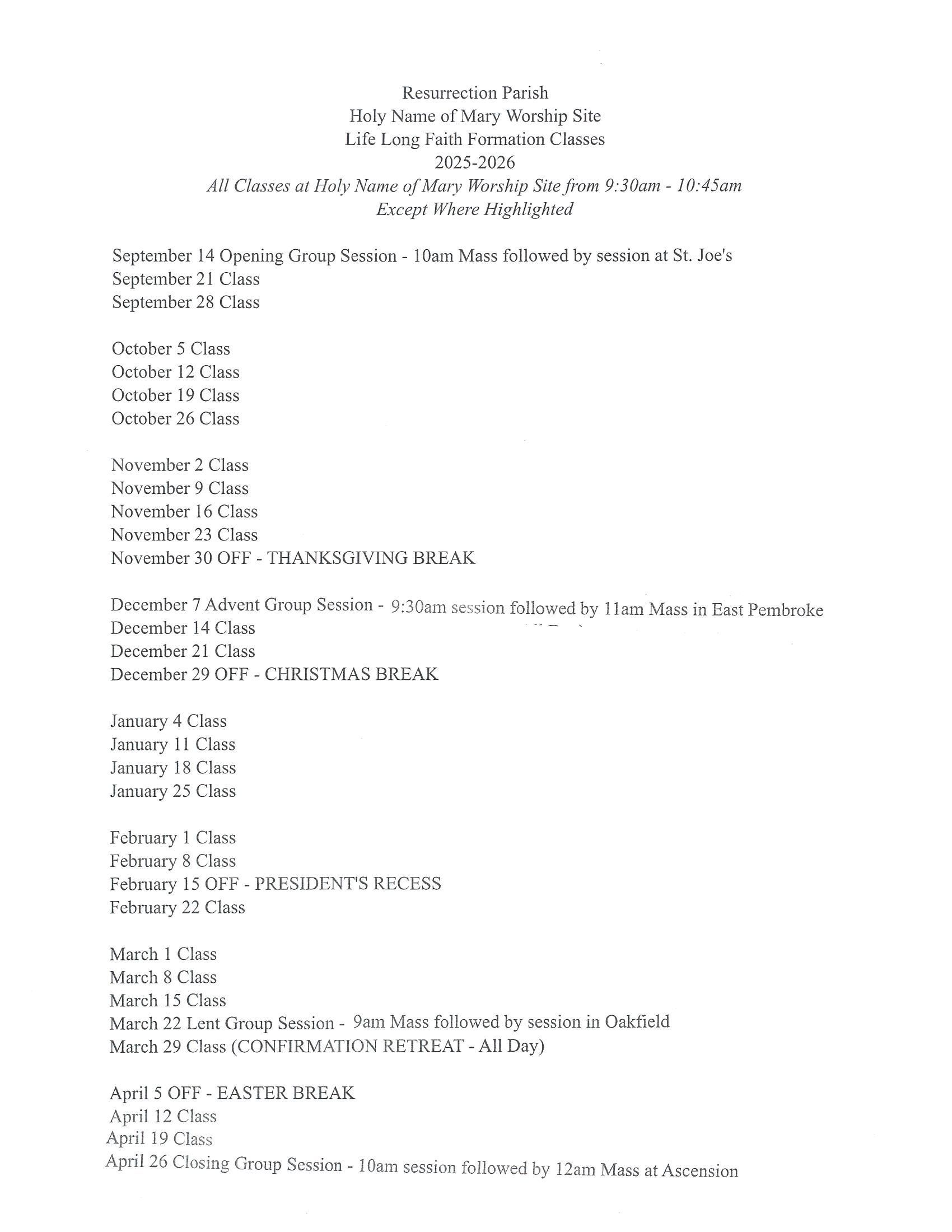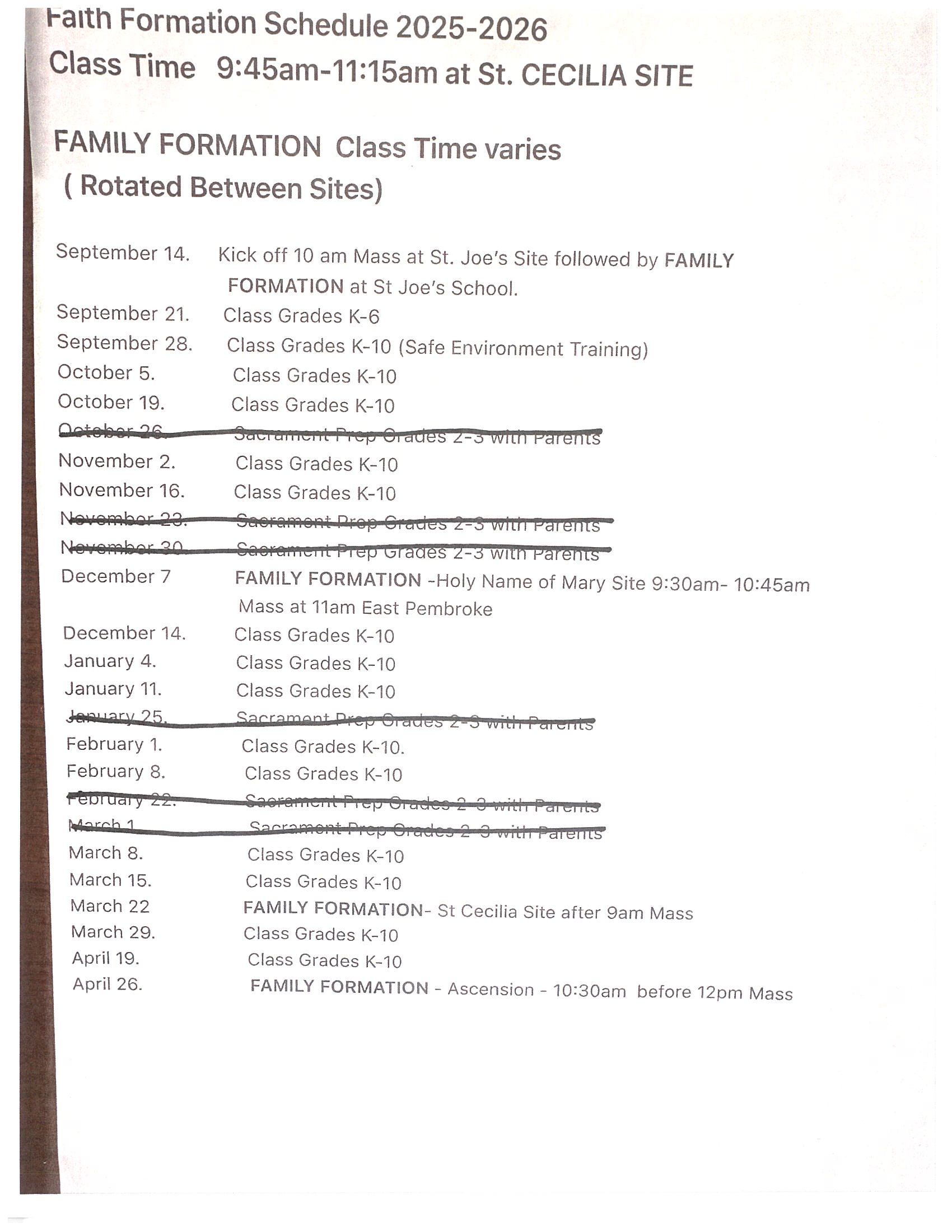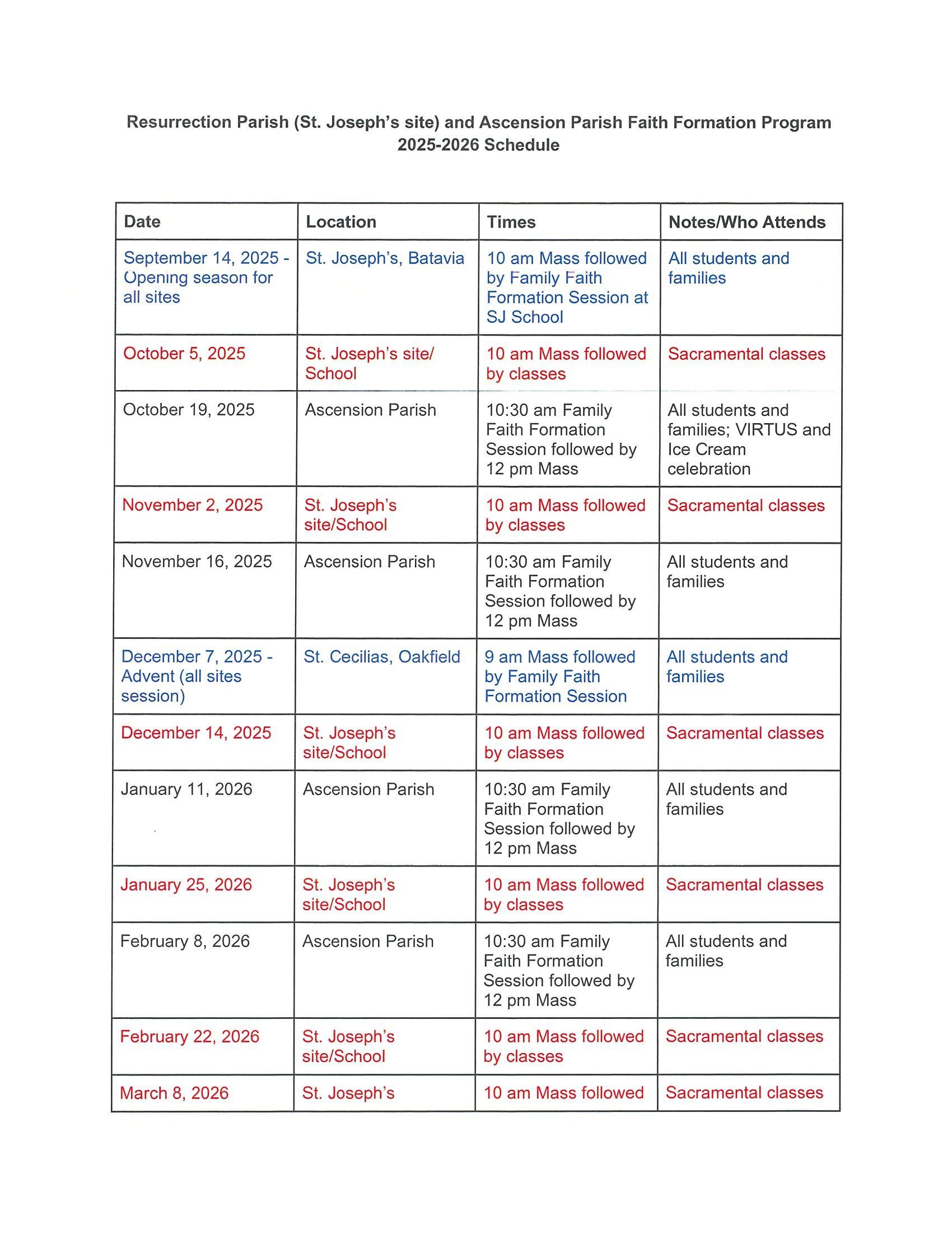 This year’s Faith Formation program will kick off with a Mass at 10am at the St. Joseph’s site in Batavia, followed by a Family Faith Formation session at St. Joseph’s School. From there, our collective worship sites will gather three more times as a complete parish at each of our sites, with individual class sessions at each worship site between those sessions. Please see the attached schedule for more details.