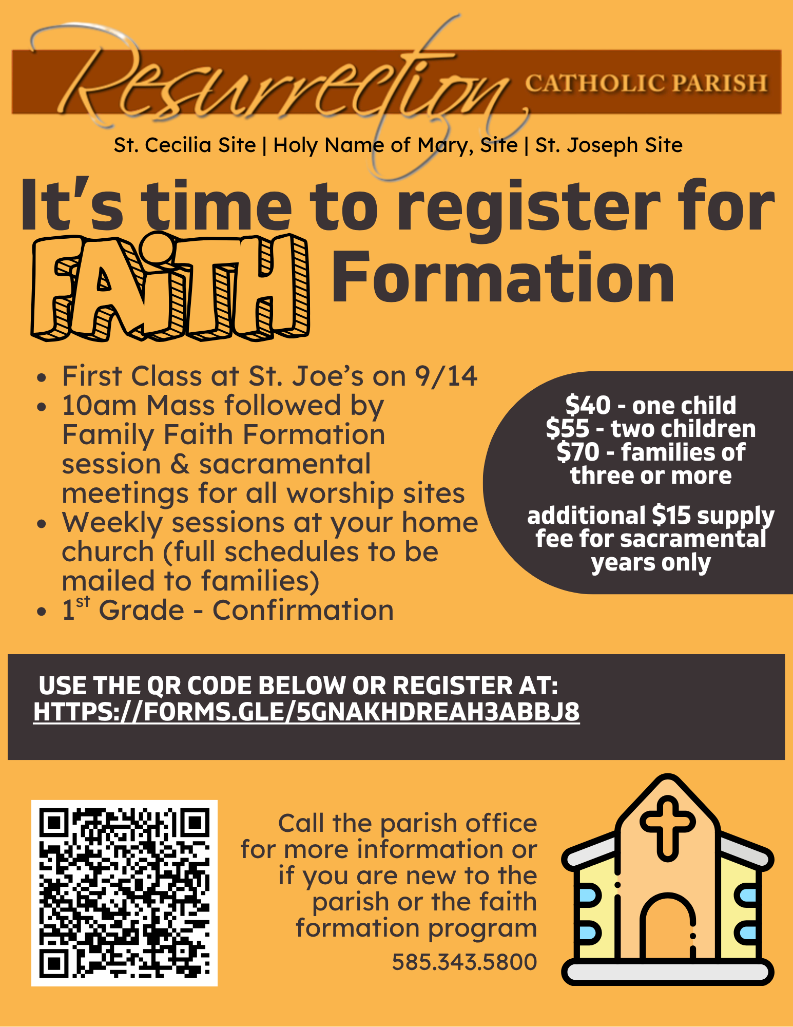 In addition, there is a $15 fee per child for sacramental preparation classes (First Reconciliation, First Communion, Confirmation).